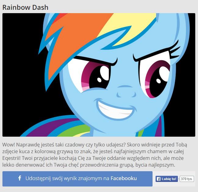 Muszę przyznać, iż w niektórych pytaniach brakowało mi odpowiedzi dla mnie, musiałem wybierać najbardziej zbliżoną. Trochę nieprecyzyjne to było, ale wyniki są następujące: 1. 2. 3. nie potrafię się zdecydować. Jeden wybór powoduje, iż albo Twilight, albo Luna, a obydwie odpowiedzi mi pasują 4. znaczy element magii Ogólnie, jeśli chodzi o te quizy, to bardzo łatwo było przewidzieć, jakie odpowiedzi prowadzą do poszczególnych wyników, więc, jeśli ktoś by chciał konkretny wynik, to by go osiągnął. Mnie osobiście rezultaty nie zaskoczyły... no, może poza Luną z trzeciego quizu (i pierwszego), ale tak jak piszę, obydwie odpowiedzi dla mnie są poprawne, więc obydwa wyniki akceptuję. Nie chce mi się wstawiać obrazków, za dużo roboty1 point
