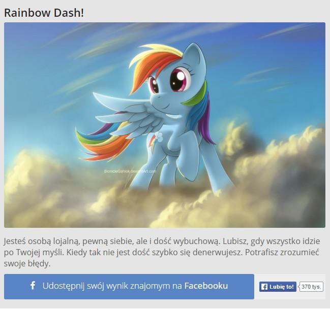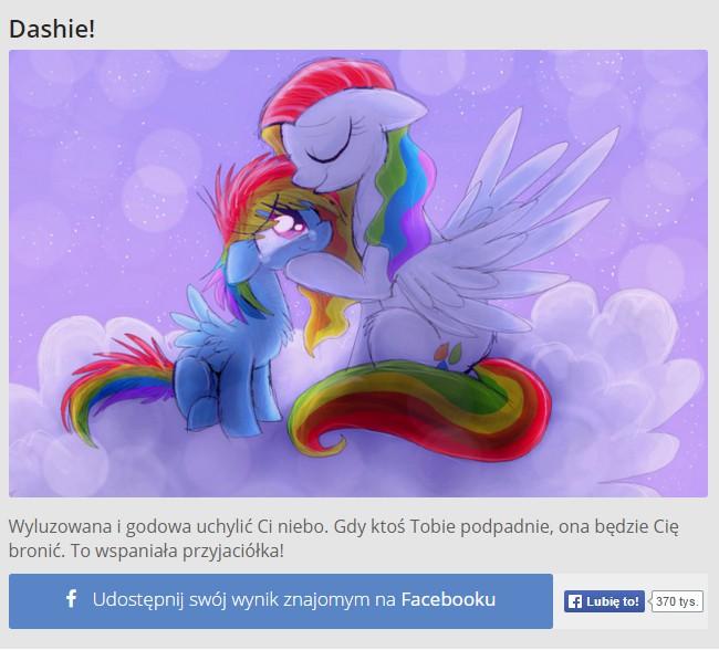 Zabawa podobna do innych, więc chyba nie trzeba nikomu tłumaczyć o co chodzi? Quizy są trzy, dlatego proszę dodawać numer przy podawaniu swoich wyników. 1. http://samequizy.pl/kto-moglby-byc-twoim-przyjacielem-w-swiecie-kucykow/#utm_source=rss&utm_medium=rss&utm_campaign=kto-moglby-byc-twoim-przyjacielem-w-swiecie-kucykow&utm_term=samequizy.pl 2. http://samequizy.pl/do-jakiego-kucyka-z-glownych-postaci-mlp-jestes-najbardziej-podobnay/#utm_source=rss&utm_medium=rss&utm_campaign=do-jakiego-kucyka-z-glownych-postaci-mlp-jestes-najbardziej-podobnay&utm_term=samequizy.pl 3.http://samequizy.pl/jakim-kucykiem-jestes-2/ 1. Mi wyszła Sunset... 2. A tutaj Twilight... 3. Tutaj natomiast mam AJ... Zapraszam1 point