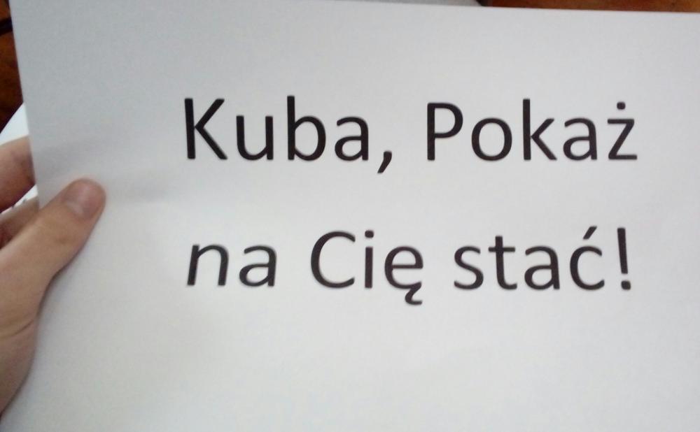 Wczoraj na dniu sztuki mój kolega, Kuba śpiewał. Koledzy chcieli zrobić mu niespodzianke i wydrukowali kilkadziesiąt kartek aby cała klasa mogła go dopingować. Nikt nie zauważył tego rażącego błędu, dlatego dostaliśmy kartki z napisem: Kuba, pokaż na Cię stać!