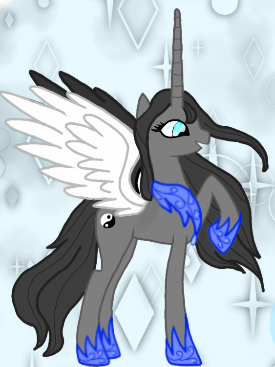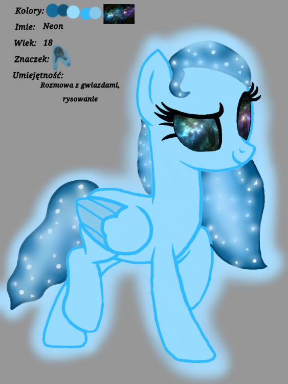 iOstatnia OC wyszła mi słabo, ale się nie poddaje i jak to mówią do trzech razy (nie ważne że to dopiero drugi raz, ale trzeci też będzie ) sztuka, więc próbujem dalej. Imie: Neon Wiek: 18 lat Rodzina: Mama- Nieznana Tata- Arrow Rodzeństwo- Brak Znaczek: (będzie pokazany na obrazku) Oznacza jej umiejętność do rozmowy z gwiazdami oraz rysowania. Charakter: Małomówna, miła, czasem chamska Biografia: Neon urodziła się w małej wsi położonej na odludziu. Mieszkała blisko lasu, razem ze swoim tatą, matki nie miała. Zostawiła ją po porodzie. Młoda klacz wiodła spokojne życie aż do tego jednego dnia który zmienił jej życie na zawsze... Podczas spacerowania po lesie, zauważyła królika za którym od razu pobiegła oddalając się od dobrze znanych ścieżek coraz dalej. W pewnym momencie królik wskoczył do nory. Chwilę stała przy norce i wołała królika, lecz, gdy nie dało to efektów poszła się dalej bawić, nie zważając że jest już bardzo daleko od domu dalej eksplorowała las. Powoli zaczęło się ściemniać, mała klacz zorientowała się że nie wie gdzie jest. Gorączkowo zaczęła szukać drogi do domu. Po dłuższym czasie poszukiwań zrezygnowana Neon skuliła się pod jednym z drzew i zaczęła płakać, bała się że nie znajdzie drogi do domu. Leżała pod drzewem i zrezygnowana patrzyła się w głąb lasu, z wciąż mokrymi od łez policzkami. W oddali zaczynała dostrzegać sylwetke kucyka, nie wiedziała czy to jawa czy halucynacje, postać była cała czarna, jedynie oczy świeciły się delikatnie na biało. Kucyk powoli zbliżał się do Neon, która patrzyła się na niego jak na obrazek, wciąż zastanawiała się czy to jawa, czy sen. Kucyk zatrzymał się, ruchem głowy pokazał Neon żeby poleciała, po czym wyciągnął skrzydła i wzbił się ponad korony drzew. Pomimo że Neon nie umiała jeszcze latać, zaczynała próbować się wznieść, pomimo wielu nieudanych prób wzniesienia się, czuła ogromną determinacje by nie poddać się i dalej walczyć. Udało się, powoli leciała w górę aż wreszcie udało się jej wylecieć ponad korony drzew. Utrzymując się na jednej wysokości błądziła wzrokiem po nocnym niebie szukając kucyka który kazał jej polecieć. Niestety po kucyku nie było ani śladu. Kolejny raz ogarnął ją smutek i strach, co teraz ma zrobić? Zadawała sobie to pytanie w myślach, nie licząc nawet że ktoś jej odpowie. - Witaj Neon - ktoś odezwał się, Neon wzdrygnęła się, zaczęła się nerwowo rozglądać, ale nigdzie nikogo nie było, czyżby kolejne halucynacje? -Spójrz w góre- odezwał się kolejny głos. Na górze nic nie było, poza gwiazdami, czyżby to one do niej mówiły? Czy to w ogóle możliwe? - T-to wy mówicie?- spytała gwiazdy nie wierząc że to dzieje się naprawdę. -Tak -odpowiedział krótko trzeci głos. Po krótkiej rozmie z nowymi znajomymy, Neon poprosiła je o pomoc w dotarciu do domu, po kilkunastu minutach była już nad swoją wioską, podziękowała gwiazdom i podleciała do domu. W trakcie lotu Neon dostała znaczek, jej grzywa i ogon zaczęły błyszczeć, a oczy stały się obrazem gwiazd. Zauważyła swoją grzywe i znaczek, zapatrzona w nie wpadła do domu przez uchylone okno, wprost pod kopyta ojca. Na początku był zły na córke, jednak złość mineła gdy zobaczł jak wygląda, na początku surowy powiedział żeby się wytłumaczyła z tak długiej nieobecności. Neon opowiedziała ojcu o całym zdarzeniu, była bardzo zmęczona więc niedługo potem poszła spać. Następnego dnia, dumna Neon poszła do szkoły, chciała pochwalić się swoim znaczkiem. Niestety w szkole nie spodkała się z takim zachowaniem na jakie miała nadzieje. Inne źrebaki zaczęły się z niej śmiać, nie tolerowały jej odmienności, uważały jej talent za niepotrzebny . Neon nie mogła znieść zachowania innych kucyków w obec niej dlatego pewnej nocy postanowiła uciec, napisała list ojcu, w którym pożegnała się z nim. Spakowała najważniejsze rzeczy i wyruszyła w podróż. Po kilku miesiącach podróży, zamieszkała w opuszczonym, domu niedaleko Ponyville. Rzadko wychodziła z domu, w dzień prawie nigdy, a jeśli już zawsze miała na sobie czarne okulary, i szary płaszcz. Na życie zarabiała rysowaniem. Gdy dorosła częściej chodziła do miasta, jednak nie wdawała się w żadne rozmowy z kucykami. Jedynym kucykiem z którym rozmawiała była Asagi, jej jedyna najlepsza przyjaciółka, która tak samo jak ona była "inna". . . I to tyle o Neon, ona jak i Asagi będą moimi głównymi OC. Napisze jeszcze tylko Asagi, bo reszta moich OC, została wymyślona jako ludzie a nie jako kucyki. I jak mi tym razem wyszło? Mam nadzieje że dobrze bo się starałam bardzo. Jakby były jakieś pytania do mnie lub do Neon to chętnie odpowiemy ^^