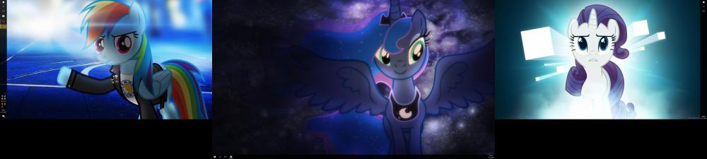 Ogólnie, to sobie naściągałem ze 130 tapet z deviantArta i wchodzą mi randomowo, więc nie sugerujcie się tym kto gdzie jest na pulpicie. Ikon żadnych nie mam, wszystko, co potrzebuje mam podpięte w kafelkach w menu Start.