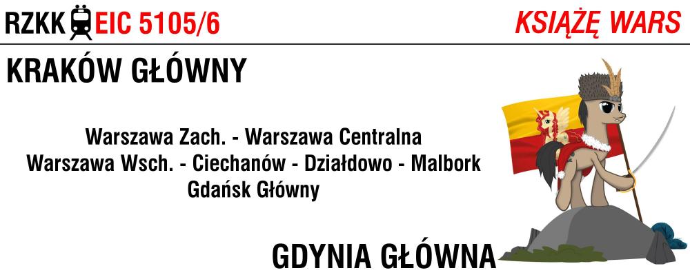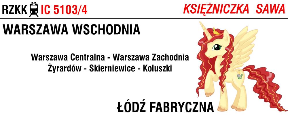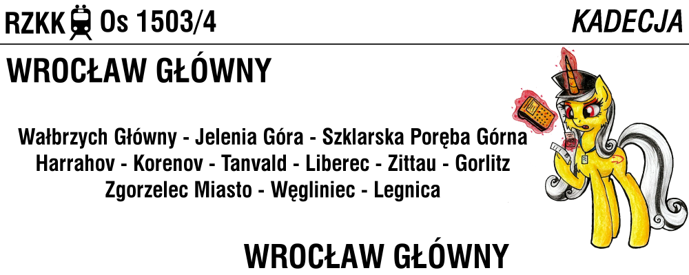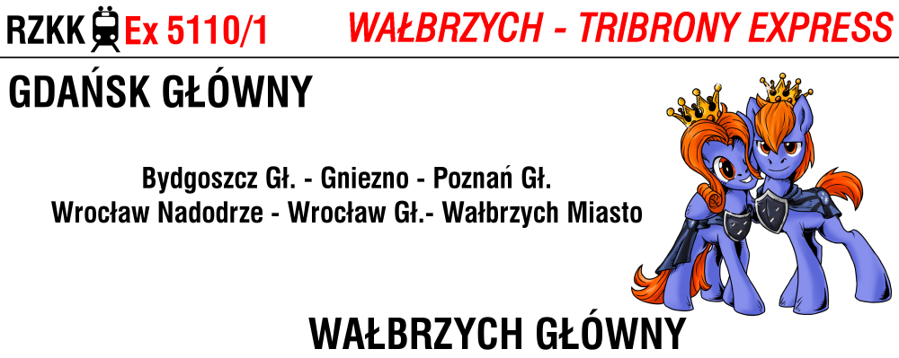 Z cyklu "mam dziwne hobby, nie zrozumiesz..." Jak większość z Was wie, jestem miłośnikiem komunikacji miejskiej i miłośnikiem kolei. Ostatnio zacząłem robić dechy relacyjne pociągów - na razie są to wyłącznie fikcyjne sztuki. Oczywiście requesty na tablice przyjmuję (za darmo), na priv proszę mi napisać stację początkową i końcową, pośrednie, nazwę pociągu i ewentualnie wysłać obrazek jaki ma na niej być (bez gore, r34 rzecz jasna). Ewentualnie robię też dechy boczne dla autobusów/tramwajów/SKM/metra. W zgłoszeniach analogicznie proszę. Temat nie wylądował w dziale graficznym, bo część dech nie jest (i nie będzie) związana z kucami. Wszystko w spoilerach. Skrót RZKK oznacza Regionalny Zakład Komunikacji w Karsznicach (fikcyjna spółka). Tablica, która została wykonana jako pierwsza: Tablice fandomowe (nietrudno się domyślić która pod jaką grupę jest): Tablice nie-fandomowe: