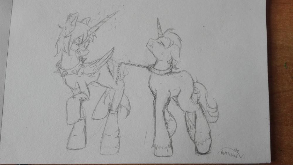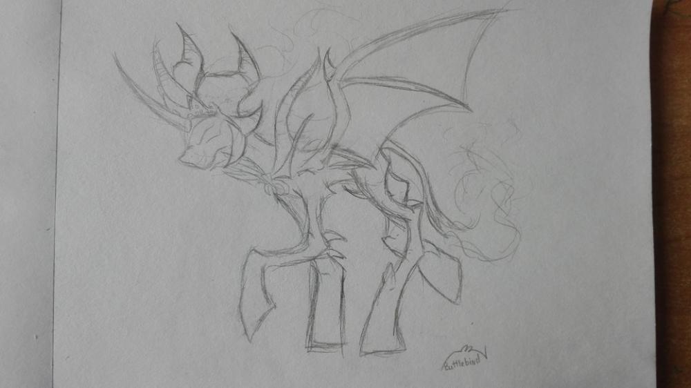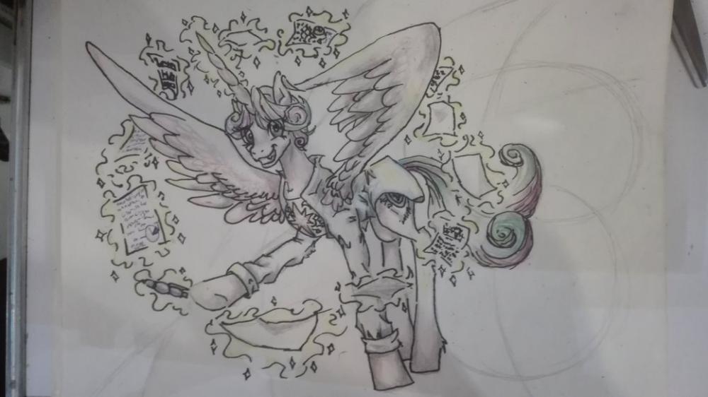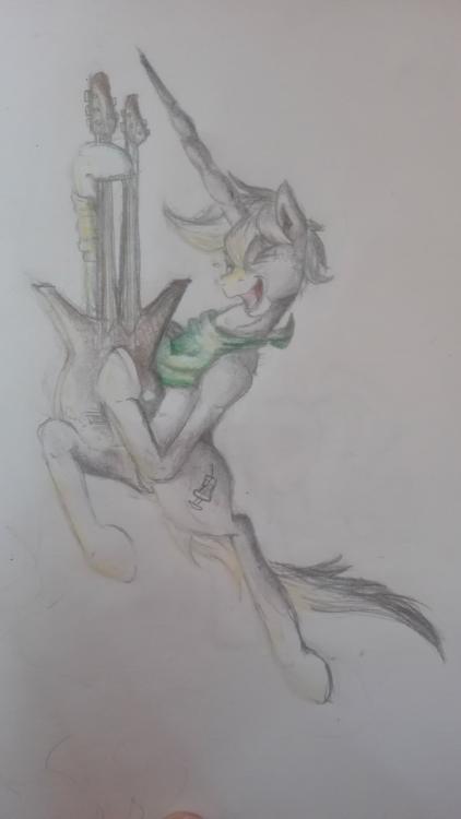 Dobra, następnym razem narysuję cię tyłem, nie będę mieć problemów z oczami Dzięki za radę, Cahan. Próbowałam ją jednak stosować, i zauważyłam, że końska anatomia nie za bardzo pasuje do przedstawiania niektórych, bardziej "ludzkich" póz, z którymi w serialu, np, nie ma problemu, i które często sama stosuję. Także na razie wychodzę z założenia, że do końskiego ustawienia kucyka nadaje się "właściwa" anatomia, a do bardziej atro - ludzka anatomia. Czyli moje kucyki są, na razie, z gumy... Okej, to do artów: Okej, w następnym poście będzie (hope you don't mind a hug ^^' ^^ Moja ulubiona ostatnio Flurry Heart Jeden z demonów- tak jakby kuzynów Istoty, Która Jeszcze Nie Ma Imienia (Ale chyba będzie się zwać Dreamstorm) I na koniec Scalpelsam z gitarą Welp, to tyle. Miłego oglądania i miłego dnia