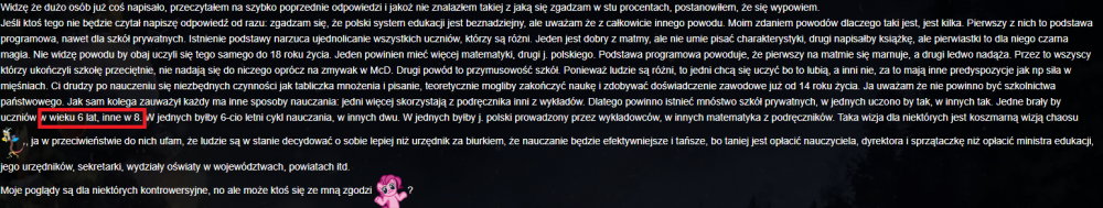 To nie jest tak, że musieli się tego nauczyć do 16 roku życia. Może nie umieli się tego nauczyć, może ktoś miał problemy rodzinne, etc. Na naukę nigdy za późno nie jest, a lepiej jest się dowiedzieć z takiej o to bajki, a niżeli nie wiedzieć nic. Zresztą definiowanie od razu MLP wyłącznie do dzieci to teraz pojęcie mega względne po tym co się ostatnio dzieje w sezonach - niektóre problemy są błahe typu "nie oceniaj książki po okładce" - swoją drogą i tak większość społeczeństwa to robi, ale mniejsza ; ale problem identyfikacji, zaprzestania bycia zaszufladkowanym to już rzecz bym powiedział bardziej ciekawa, która porusza nawet "Ferdydurke", a nie każdy ostatnio książki czytać lubi. W MLP jest tyle rzeczy do nauki, a ludzie nadal te błędy popełniają. Wiedzą? Możliwe, ale czy stosują to inna bajka. -