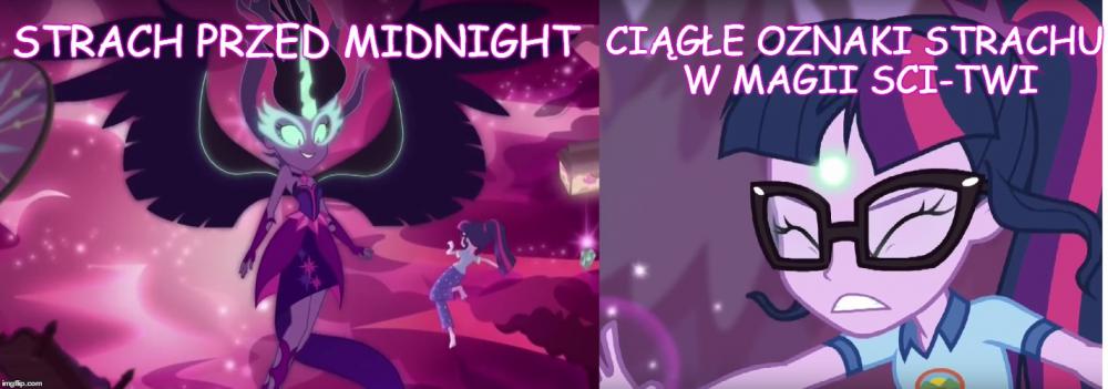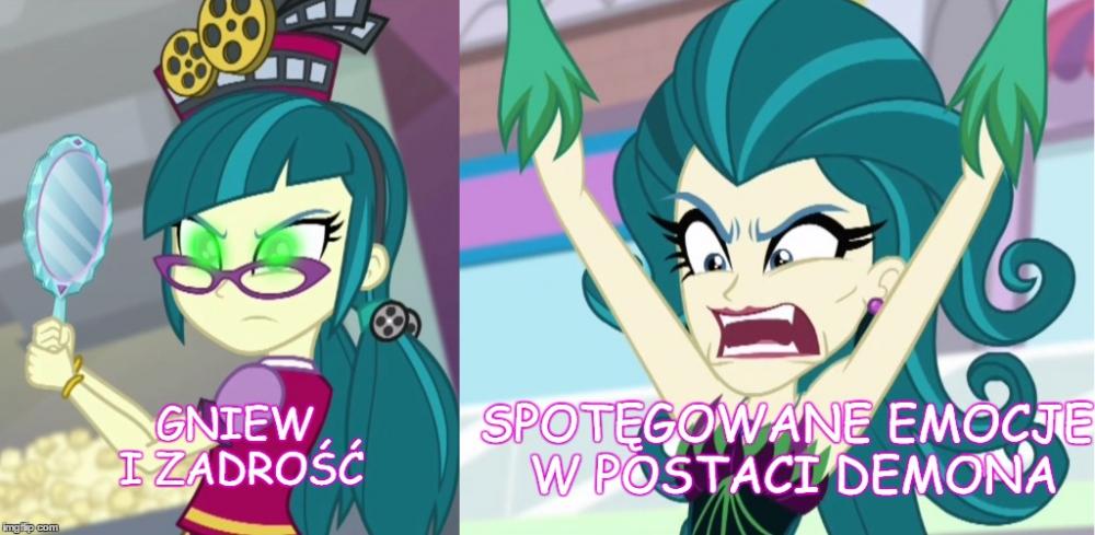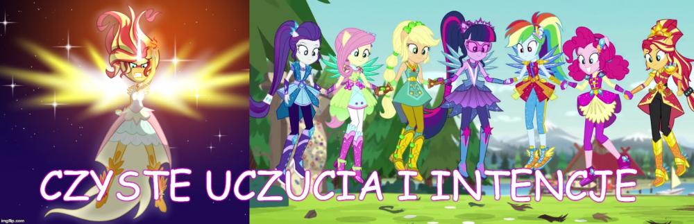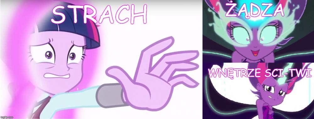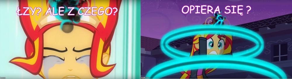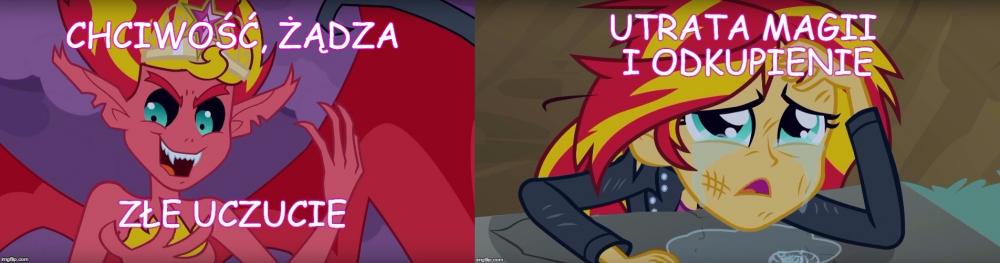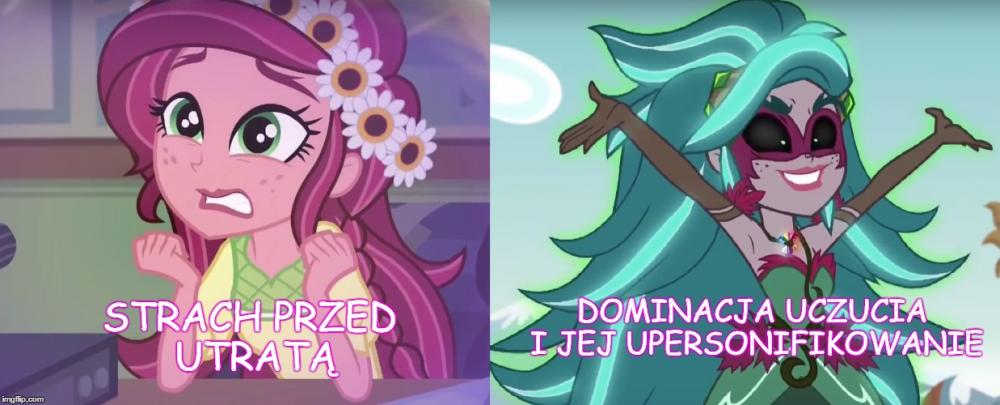 Dziś była okazja widzieć ostatni short z trzech shortów Equestria Girls. W sumie, odpowiedź na stworzony przeze mnie temat można było już uzależnić po premierze Legend of Everfree, ale dopiero ten short pokazał jak mniej więcej magia działa w świecie ludzi. Zatem zacznijmy od początku. Przygotujcie jakieś picie i popcorn, bo trochę tego jest . [Mogą pojawić się spoilery !!] [Obrazki celowo są na widoku, aby było kolorowo i aby artykuł nie miał wrażenia wyłącznie ściany tekstu] Pierwszy film EG z 2013 roku. Twilight przybywa do świata ludzi, aby odzyskać swój element harmonii w koronie, która ta została wcześniej ukradziona przez Sunset Shimmer. Na tym etapie, w świecie zamieszkanym przez ludzkie odpowiedniki main6, magia nie istnieje poza oczywiście portalem przed liceum Canterlot. Dochodzimy do punktu kulminacyjnego -> Sunset przejmuję magię elementu Twilight. Tutaj się zatrzymajmy. Sunset po włożeniu korony nie ma bynajmniej radosnej miny, wręcz przeciwnie. Początkowo jest zdziwiona co się dzieje, można przypuszczać, że nie spodziewała się takiego ogromu mocy. Po nieco dłuższej chwili widzimy, że z jej oczu ronią się łzy, które potem wyparowują. Aż do końca transformacji, Sunset po swoim wyrazie na twarzy może czuć dwie rzeczy: - Nie przewidziała, że przejęcie takiej potęgi może wywołać takie skutki i ciężko jej to znieść, - Próbuje oprzeć się całej transformacji. Obie tezy są jednakowo prawdopodobne. Pod koniec całej akcji Sunset jest szczęśliwa efektem zaabsorbowania magii. Z drugiej strony należy wziąć pod uwagę czy nadal mamy do czynienia z tą samą Sunset Shimmer. Tutaj pojawia się hipoteza mojej wypowiedzi, którą udowodnię i brzmi następująco: Czy wszystkie złe formy antagonistów i protagonistów to upersonifikowanie/zmaterializowanie ich uczuć wraz z cielesną formą osoby, która to uczucie odczuwa? Zaś po tej hipotezie przejdę do tez, które brzmią: Magia equestriańska w świecie ludzi jest uzależniona od uczuć kierującej się osoby. Oraz Magia equestriańska jest przyciągana przez złe emocje. Zatem do dzieła: ----------------------------------------------------------------------------------------------------------------------------------------------------------------------- 1) Co byłoby głównym uczuciem Sunset z 1 filmu? Byłaby to chciwość. Pragnie pożądać jak największej mocy, widać to po jej wypowiedzi przed transformacją oraz gdy deklaruje, że chce również zdobyć Equestrię i przejść przez portal. Gdy ta moc zostaje jej odebrana ona całkowicie się zmienia, widzi, że to co zrobiła była niewłaściwe i jak podkreśliła to Twilight: "Zaraz ujawnisz wszystkim kim naprawdę jesteś. Pokaż co tkwi w twoim sercu". ----------------------------------------------------------------------------------------------------------------------------------------------------------------------- 2) Przejdźmy teraz do mniej oczywistego przypadku, a konkretnie do syren. Tutaj należy pominąć analizę, gdyż syreny mają być w założeniu od początku do końca złymi postaciami. Samo ich nawiązanie do mitologicznych syren ma to utwierdzić, a także ich zachowanie przez cały film. Wypadałoby też dodać, że nie zostały w pewnym sensie "skażone" equestriańską magią, a wyłącznie zbierają negatywne emocje, np. zazdrość oraz jak w przypadku Tireka, nie ma mowy o ich nawróceniu. Dlatego antagonistów z Rainbow Rocks pominiemy i omówmy film nr 3 czyli "Friendship Games". ----------------------------------------------------------------------------------------------------------------------------------------------------------------------- 3) Sci-Twi jest tutaj idealnym potwierdzeniem mojej hipotezy. Jej kreacja w 3 filmie przypomina nieco Sunset z 1 części, ale tutaj mamy zupełnie inną emocję protagonistki. Sci-Twilight gromadzi moc pozostałych członków Rainbooms, aby potem uwolnić ją za namową dyrektor Cinch (czy Grzyb z polskiej wersji językowej). Jednak przez cały ten proces, sytuacjach kiedy kradnie moce pojedynczo naszym bohaterkom zaczyna się bać. Strach jest jej złym uczuciem, które podsyciła dyrektorka, a następnie to uczucie doprowadziło do przemiany ludzkiego odpowiednika Twilight w formę demona. Przez cały proces przemiany, jak w przypadku Sunset, próbuje temu zapobiec. Po transformacji można powiedzieć, że jej złe uczucie zatriumfowało przyjmując pewne cele Sci-Twi, np. zdobycie jak najwięcej magii i wiedzy magicznej bez względu na konsekwencje środowiska wokół niej. Prawdziwa wnętrze osoby jest kompletnie poza kontrolą, widać, że złe emocje górują nad posiadaczem magii equestriańskiej, która połączyła się z uczuciem bohatera i przybrało ucieleśnioną formę. Podczas całego zajścia ulega zniszczeniu także portal do Equestrii. ----------------------------------------------------------------------------------------------------------------------------------------------------------------------- 4) Przedostatnim argumentem w mojej analizie będzie 4 część filmowej serii Equestria Girls, a mianowicie "Legend of Everfree". Tam trudno orzec czy antagonistą Gloriosa jest czy nie, gdyż ta od samego początku nie chce źle. Jednak jak w przypadku Sci-Twi z 3 części filmu, też i opiekunka obozu czuje strach przed utratą Everfree Camp. Jest zdolna nawet użyć magii, aby uratować ukochane miejsce. Znów dochodzi do transformacji, kiedy Gloriosa przejmuje ostanie klejnoty przepełnione magią z jaskini. I jak w przypadku powyżej dochodzi do ziszczenia planu bez względu na to co się wydarzy z otoczeniem. ----------------------------------------------------------------------------------------------------------------------------------------------------------------------- 5) Zanim przejdziemy do Juniper Montage z najnowszych shortów, przyjrzyjmy się jeszcze Sci-Twi w tej omawianej części. Mimo odzys