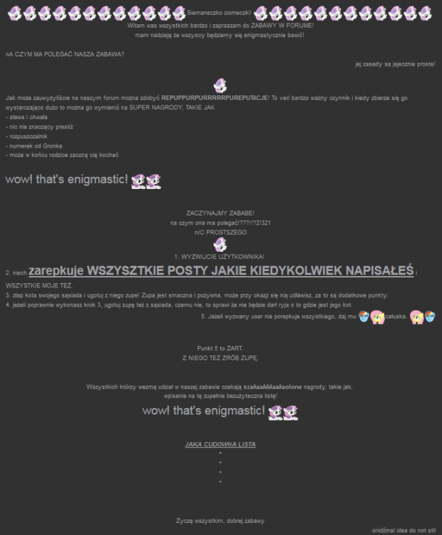 Jakiś długi czas temu już wymyśliłem, że będę wyróżniał osoby, bez których ten dział już od dawna mógłby nie istnieć, osoby które dodały drewna do ogniska zwanego "Nowym Królestwem Thoraxa". Także bez przedłużania: 1. Najbardziej aktywna osoba 2. Ten od ambitnych tytułów 3. ... i ten od mniej ambitnych tytułów. 4. Największy kawalarz 5. "Obraziłem tylko Chrysalis, nikogo innego" 6. Naczelny Tęczling 7. A także Naczelna Tęczlingowa ( ) 8. Największy hejter "podmieńców których rasy nie należy tu pisać" 9. Pupilek Thoraxa 10. Największy samozwańczy wróg działu 11. Nieumyślny Zwiększasz Popularności Dziękuję także reszcie nie wymienionej w wyróżnieniach, za ciekawe żarty, niepoprawnie polityczne tytuły, hejt na nowe tęczlingi i thoraxa i wiele innych! Dobrze wam się wydaje, że ten post może być jednym z ostatnich ... ZAWIESZAM DZIAŁALNOŚĆ NOWYCH ZABAW aż do czasu wyjścia nowego sezonu. Mam nadzieję, że nowy sezon i film da ostatniego kopa w dupę użytkownikom tego forum i zaczną onicoś pisać ciekawego! Kolejnymi tematami pewnie będą jakieś fanfiki odnośnie życia Thoraxa i naukowa dyskusja na temat "skąd się wzięły changelingi" i jak to się stało, z naukowego punktu widzenia, że zostały odmienione. Ale jedno wiem, nie będzie to w najbliższym czasie. Jeszcze raz wszystkim dziękuję, Wasz Miszcz Tencz Ps. Jeśli chcecie dalej pisać w tematach zabawowych i dyskusyjnych to proszę się nie krępować, będę odpisywał.