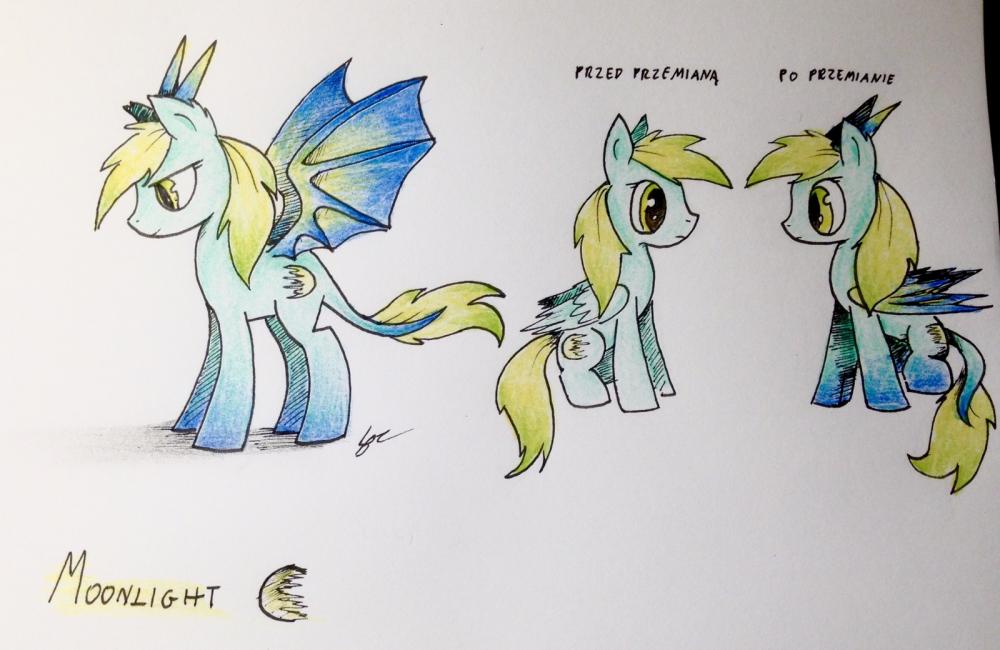 Starray Napisano Wrzesień 13, 2017 Share Napisano Wrzesień 13, 2017 Imię: Moonlight Wiek: 20 lat Rasa: pegaz Wygląd: (rysunek) jasno-morska sierść, jasnożółta grzywa z zielonymi końcówkami. Oczy w tym samym kolorze co grzywa. Po przemianie końcówki kopyt są granatowe, a skrzydła (wyglądające wtedy jak smocze/nietoperze) i rogi są granatowo - żółte. Źrenice po przemianie są pionowe. Zainteresowania: Lubi latać, ale nie z zawrotną prędkością. Zbiera wszystko, co ją zaciekawi, więc u siebie ma małą graciarnię. Ciekawią ją szyfry i wszelkie rodzaje zakodowanych wiadomości. Nie lubi, kiedy ktoś robi cokolwiek z jej grzywą. Jej ulubiony owoc - borówki. Charakter: Małomówna, spokojna. Czasami jest to irytujące bo kiedy ma mało czasu zachowuje się jakby miała jeszcze pół dnia. Dla obcych kucyków jest nieśmiała, tak, jakby miała w środku jakąś blokadę. Ale w gronie bliższych znajomych śmiało rozmawia, rzuca ripostami i jest duszą towarzystwa. Kiedy była jeszcze źrebakiem, przez przypadek rzucono na nią mocne zaklęcie. Przez to w każdą noc wyrastają jej proste rogi, a skrzydła i ogon robią się bardziej smocze. (rysunek) Z nadejściem świtu znów jest sobą. Zdążyła się już do tego przyzwyczaić (również do tego, aby nie spać na plecach, bo rano znajduje dziurawą poduszkę). Nie do końca pamięta, co robiła po przemianie, ale nie ma z tym na razie problemu. Spędza przecież ten czas jak każdy - śpiąc. Jest jeszcze jeden efekt uboczny - Moonlight nie ważne, czy jest noc, czy dzień, bardzo słabo czuje jakikolwiek zapach. Czasami to jest nawet przydatne, ale na pewno zmniejsza to jej czujność. Co do przemian, wiedzą o nich tylko trzy kucyki - jej mama, jej tata (którzy dawno wyjechali do Cloudsdale) i oczywiście ona. Woli zostać nomalna póki jest to możliwe. --- może być karta postaci? Jeśli nie może być z tym zaklęciem/klątwą to napisz, zmienię. Link do komentarza Udostępnij na innych stronach More sharing options...
